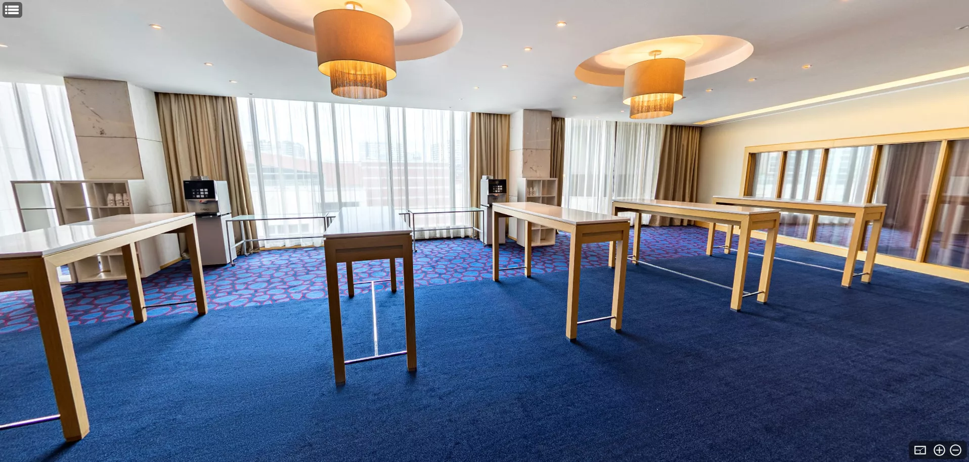 Фойе Синего зала – ​идеальное место для встречи гостей, организации кофе-брейков или фуршетов. Благодаря своему современному и универсальному дизайну, это помещение также прекрасно подходит для проведения выставок